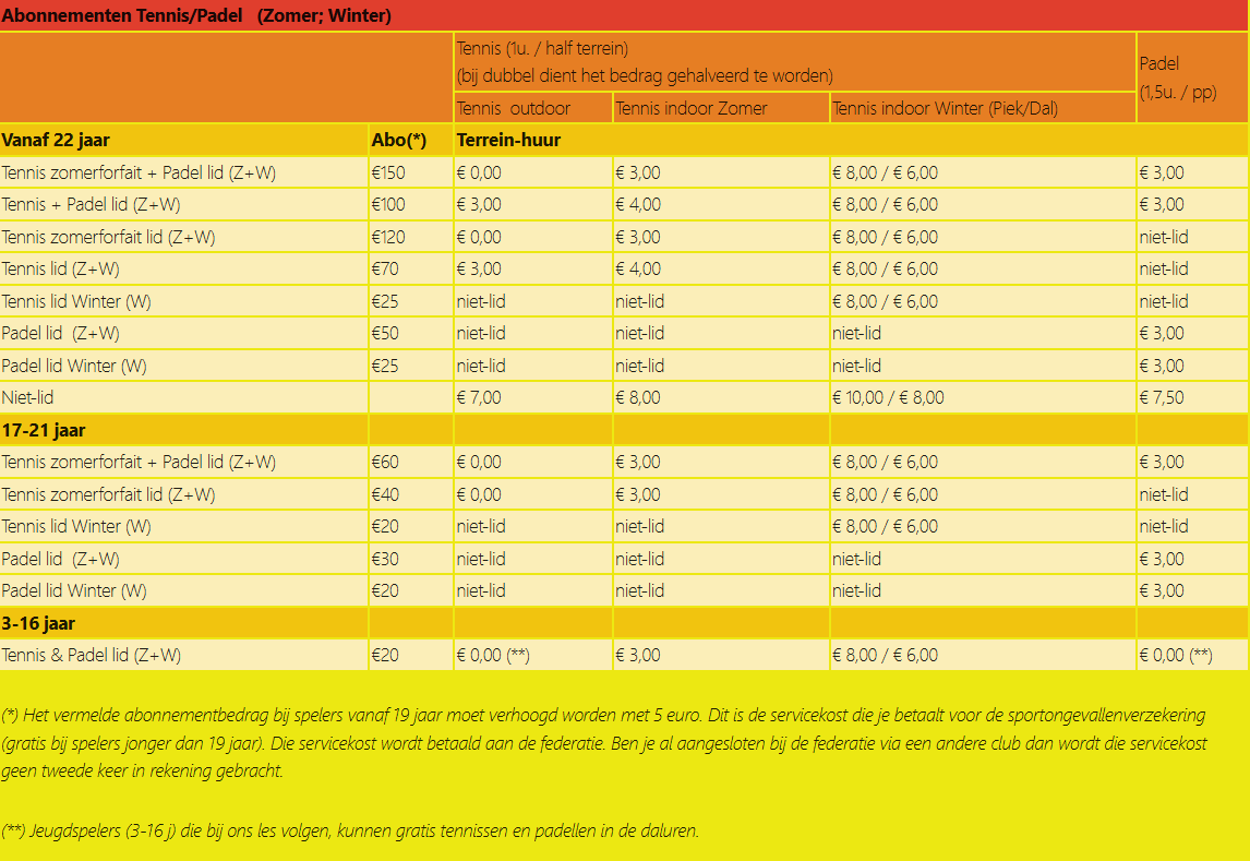 Volgens de richtlijnen van de Vlaamse tennisbond zijn wij organisatorisch en verzekeringstechnisch verplicht ieder lid in te schrijven bij Tennis Vlaanderen. Dit doe je door het nemen van een clubabonnement.